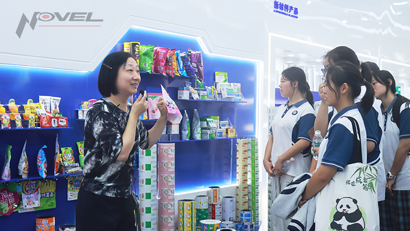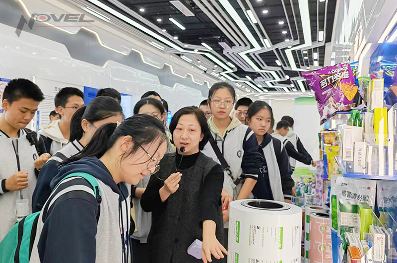 座談結(jié)束,在工作人員的帶領(lǐng)下,研學(xué)團(tuán)隊先后參觀了永新股份展廳和MES系統(tǒng)控制中心。展廳內(nèi),各品類包裝產(chǎn)品、高性能薄膜琳瑯滿目,從食品包裝到工業(yè)應(yīng)用,從環(huán)保材料到智能包裝,工作人員詳細(xì)介紹了產(chǎn)品的研發(fā)過程、性能特點(diǎn)及應(yīng)用領(lǐng)域,讓同學(xué)們直觀感受到包裝材料的多樣“膜”力。MES系統(tǒng)控制中心內(nèi),永新股份信息部經(jīng)理王健與同學(xué)們進(jìn)行互動問答,現(xiàn)代化的智能管理界面實(shí)時呈現(xiàn)著生產(chǎn)全流程數(shù)據(jù),同學(xué)們紛紛感嘆工業(yè)智能化帶來的高效與精準(zhǔn)。